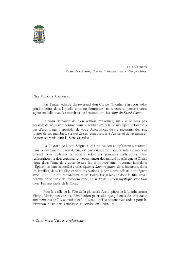• In the letter below, Archbishop Vigano sent his episcopal blessing to a group of pilgrims (Friends of the Sacred Heart, a French Resistance group of young people) led by Fr. Salenave (SAJM), and also mentions that he sends this letter through Don Curzio Nitoglia (Resistance - Italy, and a close friend of Bishop WIlliamson).